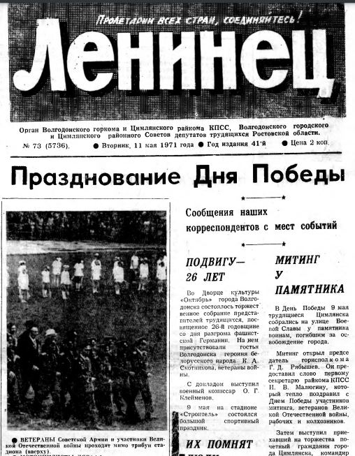 9 мая трудящиеся города и района торжественно отметили День Победы советского народа в Великой Отечественной войне. Публикуем сообщения наших корреспондентов с мест событий. 9 мая. Площадь Победы. Сегодня здесь, как и На всех улицах Волгодонска, необычное оживление. Необычно выглядят и празднично одетые люда. На груди многих из них — ордена и медали». На трибуне—члены городского комитета партии, ветераны войны, передовики производства, представители славной комсомолии города. Перед трибуной замерли в стройных рядах колонн бывшие воины—многие из них в военной форме, Юные моряки, пионеры. Митинг, посвященный 25-летию победы над фашистской Германей, открывает первый секретарь ГК КПСС Б. И. Головец. —Двадцать пять лет назад, — говорит он,—наша страна одержала великую победу... Мы совершили бессмертный подвиг... Весь мир смотрел на нас, как на спасителей—паша армия принесла свободу многим Народам... Но свобода завоевана дорогой ценой. 20 миллионов жизней унесла война. Нот ни одной советской семьи, в которой она не оставила бы свой трагический след... Никто не забыт, ничто не забыто... Тов. Головец предлагает почтить память павших, известных и неизвестных героев, минутой молчания... Люди обнажили головы. На площадь опустилась торжественая тишина. Слышно только гул кое постукивание метронома, словно биение большого сердца... В память тех, кто дал нам возможность радоваться сегодня миру и солнцу, воздвигнут в нашем городе обелиск Победы. Первый секретарь ГК КПСС тов. Голпиец сдергивает покрывало, п под торжественные звуки оркестра открывается величественная многометровая стела с ордером Победы у верхней отметки. На площадь въезжают мотоциклисты — участники мотопробега по пестам боевой сливы. Они привезли землю героического Бреста Звучат здравицы во славу великого советского народа. Коммунистической партии, доблестных Вооруженных Сига. На митинге выступил бывший партизан тов. Омельченко, рассказавший о мужестве романовских подпольщиков, среди которых большинство были коммунисты и комсомольцы. Наказом молодым звучат слова участника Отечественной войны тов. Вяльцева: — Пожар войны отшумел, ко угли его еще тлеют. Западная Германия снова представляет собой грозную военную силу, вдохновляемую реваншистами... Мы должны всегда быть готовы встать на защиту завоеваний социализма. Старшина запаса заточник опытно-экспериментального завода Виктор Сердюков, как бы принимая эстафету, поклялся, что где бы он его сверстники пи были, он всегда в любой момент готовы встать за защиту Родины. Учиник школы № 7 Сергей Садчков благодарит отцов и дедов от имени своего поколения. — Мы организуем походы по местам боевой славы, — говорит ш . — Н свято храним каждую крупицу нового, рассказывающего о великом подвиге... Мы стремимся делать свою жизнь с отцов наших и дедов, завоевав для вас мир и свободу... Женщина в строгом черном платье прижимает руки к груди — она заметно волнуется. — Вот так каждый раз переживаю, когда меня приглашают на открытие памятника павшим, — говорит она. — Это Екатерина Евгеньевна Григор, мать архитектора, ныне воина, по чьему проекту только что открытый Рядом— его отец, Иванович Григор. Митинг закрывается торжественным маршем ветеранов войны. Вот они идут — Толчеев, руководитель передовой смены лесокомбината, Гуров, Головин, у ко