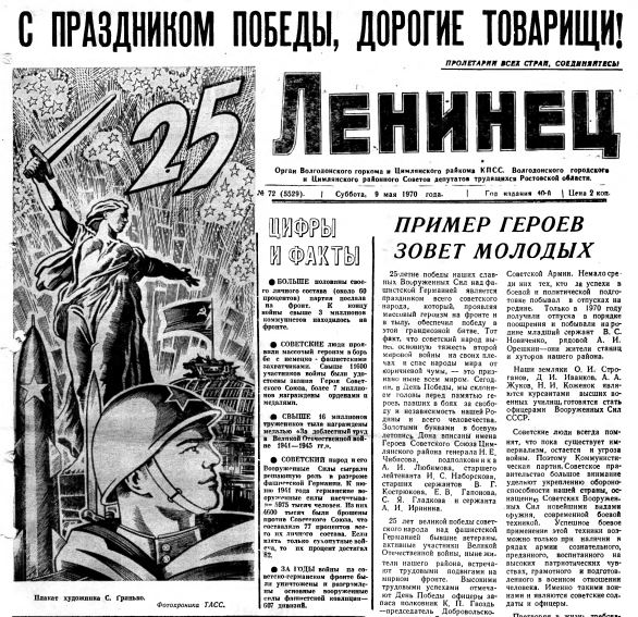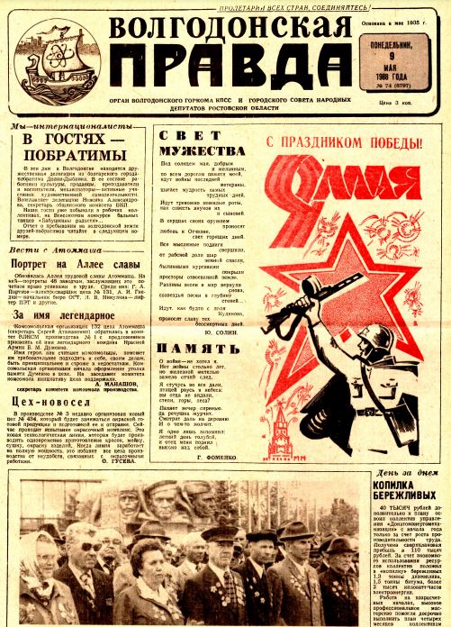С раннего утра на улицах нашего города играют духовые оркестры. Сегодня Праздник Победы. Праздник, с сединою на висках. Под звуки духового оркестра строится почетный караул. Выстраиваются ташке отряды юнармейцев, победителей в военно-патриотической игре «Зарница», «Орленок», колонны барабанщиц. Перед строем почетного караула выступает председатель горисполкома А. Е. Тягливый. Он тепло и сердечно поздравляет ветеранов и всех присутствующих с праздником. Наступает волнующая церемония возложения цветов к монументу Победы. Минута молчания. Гремит оружейный салют. Троекратным «ура» отзывается площадь на здравицы в честь великого народа - победителя, коммунистической партии. Под звуки духового оркестра праздничная колонна направляется к стадиону «Строитель». 9.00. На стадионе все уже готово к празднику. Звучит сигнал фанфар: «Слушайте все!». Выстрелы из 12 ракетниц — и в небо взмывают воздушные шары с вымпелами: «Слава КПСС», «Ленину слава», «Слава народу победителю». По дорожке стадиона движется эскорт мотоциклистов с флагами. И снова звучит музыка. Круг почета идут ветераны, наши земляки: старшина В. Ф. Корявый, награжденный орденами Славы второй и третьей степени: младший лейтенант П. П. Кузьменко, кавалер ордена Славы третьей степени, ордена Красной Звезды: сержант В. Н. Смиркин, кавалер орденов Славы второй и третьей степени; гвардии старший сержант В. С. Стальное, кавалер орденов Славы второй и третьей степени; старшина П. П. Толчеев, награжденный орденами Славы второй и третьей степени, орденом Красной Звезды; старшина И. П. Ширшов, кавалер ордена Красной Звезды, ордена Славы третьей степени; старшина В. Т. Антифеев, кавалер ордена Красного Знамени, ордена Отечественной войны второй степени; старшина В. М. Букша, награжденный орденом Отечественной войны второй степени, орденом Красной Звезды и другими правительственными наградами; младший сержант Е. Ф. Белобородов, кавалер орденов Отечественной войны первой и второй степени, Красной Звезды; старший сержант Р. И. Белоброва, кавалер ордена Богдана Хмельницкого. Сегодня в Волгодонске на Празднике Победы среди ветеранов — ветераны 62-8-й гвардейской армии, прошедшей путь от Сталинграда до Берлина под командованием Маршала Советского Союза В. И. Чуйкова. В их числе радист Б. Н. Радионов, разведчик И. А. Розенбаум, медицинская сестра М. Ф. Яковлева, полковник, командир полка В. А. Бутунов, командир роты П. И. Вязьмин, связистка М. П. Ефремова и другие. Почетное право поднять Стяг Победы предоставлено ветеранам Великой Отечественной, подполковнику Г. В. Вяльцеву, майору М. М. Рудину, капитану Г. Н. Шелегу, капитану Н. И. Чиркову. На притихшем стадионе звучит Гимн Советского Союза. С приветственным словом к собравшимся обращается первый секретарь горкома КПСС И. Ф. Учаев. Он сердечно поздравил ветеранов, волгодонцев с праздником. Отметил большой трудовой подъем, с которым горожане встретили День Победы. Выступает заместитель председателя областного совета ветеранов 62-8-й гвардейской Н. И. Родионов: — По приглашению партийных, советских, комсомольских организаций в Волгодонск и Цимлянск с разных концов нашей страны приехали 95 ветеранов. Это гвардейцы - сталинградцы прославленной 74-й дивизии и других частей 62-8-й гвардейской армии. В мирное время, несмотря на возраст, раны, нанесенные войной, ветер
