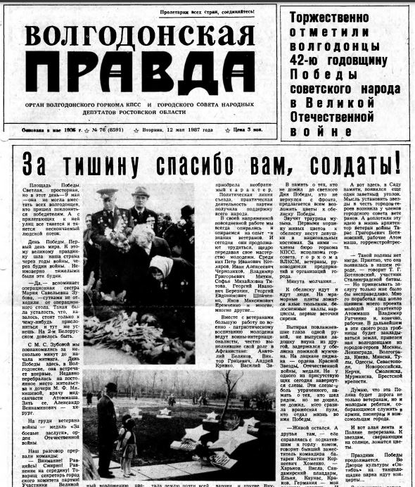 9 мая трудящиеся города и района торжественно отметили День Победы советского народа в Великой Отечественной войне. Публикуем сообщения наших корреспондентов с мест событий. 9 мая. Площадь Победы. Сегодня здесь, как и На всех улицах Волгодонска, необычное оживление. Необычно выглядят и празднично одетые люда. На груди многих из них — ордена и медали». На трибуне—члены городского комитета партии, ветераны войны, передовики производства, представители славной комсомолии города. Перед трибуной замерли в стройных рядах колонн бывшие воины—многие из них в военной форме, Юные моряки, пионеры. Митинг, посвященный 25-летию победы над фашистской Германей, открывает первый секретарь ГК КПСС Б. И. Головец. —Двадцать пять лет назад, — говорит он,—наша страна одержала великую победу... Мы совершили бессмертный подвиг... Весь мир смотрел на нас, как на спасителей—паша армия принесла свободу многим Народам... Но свобода завоевана дорогой ценой. 20 миллионов жизней унесла война. Нот ни одной советской семьи, в которой она не оставила бы свой трагический след... Никто не забыт, ничто не забыто... Тов. Головец предлагает почтить память павших, известных и неизвестных героев, минутой молчания... Люди обнажили головы. На площадь опустилась торжественая тишина. Слышно только гул кое постукивание метронома, словно биение большого сердца... В память тех, кто дал нам возможность радоваться сегодня миру и солнцу, воздвигнут в нашем городе обелиск Победы. Первый секретарь ГК КПСС тов. Голпиец сдергивает покрывало, п под торжественные звуки оркестра открывается величественная многометровая стела с ордером Победы у верхней отметки. На площадь въезжают мотоциклисты — участники мотопробега по пестам боевой сливы. Они привезли землю героического Бреста Звучат здравицы во славу великого советского народа. Коммунистической партии, доблестных Вооруженных Сига. На митинге выступил бывший партизан тов. Омельченко, рассказавший о мужестве романовских подпольщиков, среди которых большинство были коммунисты и комсомольцы. Наказом молодым звучат слова участника Отечественной войны тов. Вяльцева: — Пожар войны отшумел, ко угли его еще тлеют. Западная Германия снова представляет собой грозную военную силу, вдохновляемую реваншистами... Мы должны всегда быть готовы встать на защиту завоеваний социализма. Старшина запаса заточник опытно-экспериментального завода Виктор Сердюков, как бы принимая эстафету, поклялся, что где бы он его сверстники пи были, он всегда в любой момент готовы встать за защиту Родины. Учиник школы № 7 Сергей Садчков благодарит отцов и дедов от имени своего поколения. — Мы организуем походы по местам боевой славы, — говорит ш . — Н свято храним каждую крупицу нового, рассказывающего о великом подвиге... Мы стремимся делать свою жизнь с отцов наших и дедов, завоевав для вас мир и свободу... Женщина в строгом черном платье прижимает руки к груди — она заметно волнуется. — Вот так каждый раз переживаю, когда меня приглашают на открытие памятника павшим, — говорит она. — Это Екатерина Евгеньевна Григор, мать архитектора, ныне воина, по чьему проекту только что открытый Рядом— его отец, Иванович Григор. Митинг закрывается торжественным маршем ветеранов войны. Вот они идут — Толчеев, руководитель передовой смены лесокомбината, Гуров, Головин, у ко
