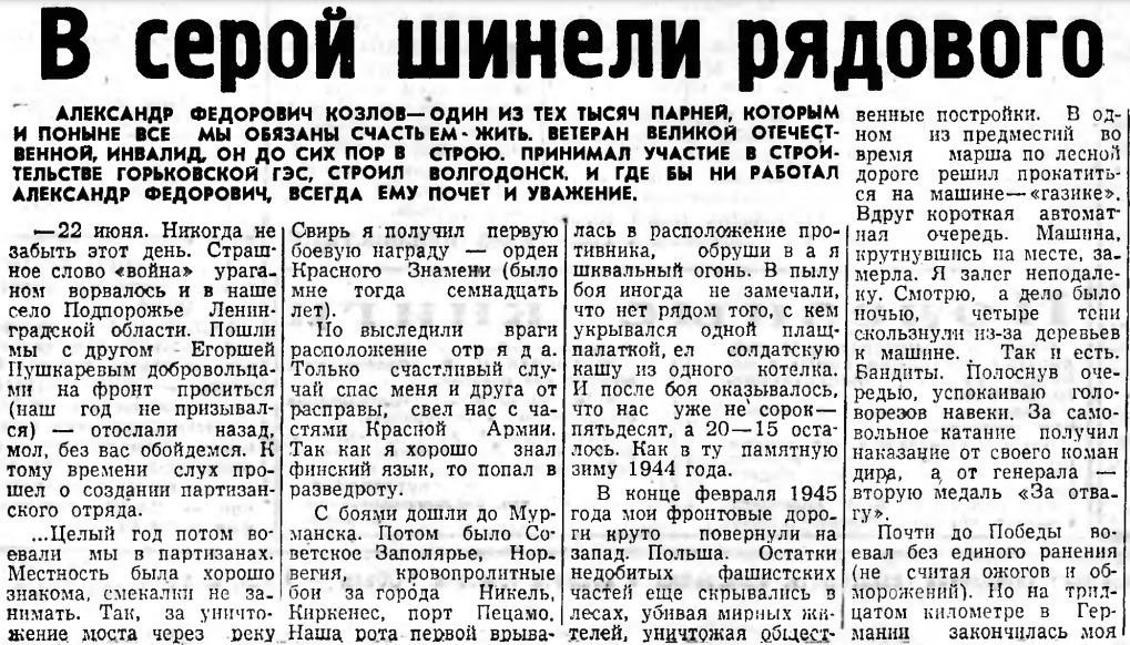 АЛЕКСАНДР ФЕДОРОВИЧ КОЗЛОВ— ОДИН ИЗ ТЕХ ТЫСЯЧ ПАРНЕЙ, КОТОРЫМ И ПОНЫНЕ ВСЕ МЫ ОБЯЗАНЫ СЧАСТЬ ЕМ- ЖИТЬ. ВЕТЕРАН ВЕЛИКОЙ ОТЕЧЕСТВЕННОЙ, ИНВАЛИД, ОН ДО СИХ ПОР В СТРОЮ. ПРИНИМАЛ УЧАСТИЕ В СТРОИТЕЛЬСТВЕ ГОРЬКОВСКОЙ ГЭС, СТРОИЛ ВОЛГОДОНСК. И ГДЕ БЫ НИ РАБОТАЛ АЛЕКСАНДР ФЕДОРОВИЧ, ВСЕГДА ЕМУ ПОЧЕТ И УВАЖЕНИЕ. — 22 июня. Никогда не забыть этот день. Страшное слово «война» ураганом ворвалось и в наше село Подпорожье Ленинградской области. Пошли мы с другом Егоршей Пушкаревым добровольцами на фронт проситься (наш год не призывался) — отослали назад, мол, без вас обойдемся. К тому времени слух прошел о создании партизанского отряда. ...Целый год потом воевали мы в партизанах. Местность была хорошо знакома, смекалки не занимать. Так, за уничтожение. моста через секу. Свирь я получил первую боевую награду — орден Красного Знамени (было мне тогда семнадцать лет). Но выследили враги расположение отряда. Только счастливый случай спас меня и друга от расправы, свел нас с частями Красной Армии. Так как я хорошо знал финский язык, то попал в разведроту. С боями дошли до Мурманска. Потом было Советское Заполярье, Норвегия, кровопролитные бои за города Никель, Киркенес, порт Пецамо. Наша, рота первой вырывалась в расположение противника, обрушивая шквальный огонь. В пылу боя иногда не замечали, что нет рядом того, с кем укрывался одной плащпалаткой, ел солдатскую кашу из одного котелка. И после боя оказывалось, что нас уже не сорок— пятьдесят, а 20— 15 осталось. Как в ту памятную зиму 1944 года. В конце февраля 1945 года мои фронтовые дороги круто повернули на запад. Польша. Остатки недобитых фашистских частей еще скрывались з лесах, убивая мирных жителей, уничтожая общественные постройки. В одном из предместий во время марша по лесной дороге решил прокатиться на машине— «газике». Вдруг короткая автоматная очередь. Машина, крутнувшись на месте, замерла. Я залег неподалеку. Смотрю, а дело было ночью, четыре тени скользнули из-за деревьев к машине. Так и есть. Бандиты. Полоснув очередью, успокаиваю головорезов навеки. За самовольное катание получил наказание от своего командир, а, от генерала — вторую медаль «За отвагу». Почти до Победы воевал без единого ранения (не считая ожогов и обморожений'). Но на тридцатом километре в Германии закончилась моя боевая биография. Тяжелая контузия, многочисленные осколочные ранения на полгода уложили меня на госпитальную койку. И долгожданный день встретил уже в Проскурове (на Украине). Не было на свете голубее неба, ярче солнца, счастливее этого дня! И не было горше воспоминаний, чем воспоминания о тех, кому не суждено было дожить до этого праздника. Не обошла беда и нашу семью, погиб - старший брат Василий, умерли в концлагере отец, а в эвакуации мать... Каждый, кто пережил войну, познал горечь утрат и не хочет, чтобы все повторилось сначала. Пусть нашим детям никогда не придется разрушать дворцы, мосты, все то, что создает человек, а внукам — оставаться сиротами. А. КОЗЛОВ, слесарь химзавода.